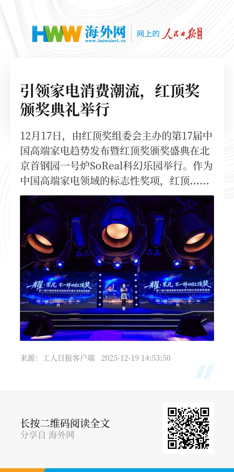 12月17日,由红顶奖组委会主办的第17届中国高端家电趋势发布暨红顶奖颁奖盛典在北京首钢园一号炉SoReal科幻乐园举行。作为中国高端家电领域的标志性奖项,红顶奖始终致力于弘扬品质生活、引导消费潮流,更承载着推动产业转型升级、促进消费品质升级的使命与初心。