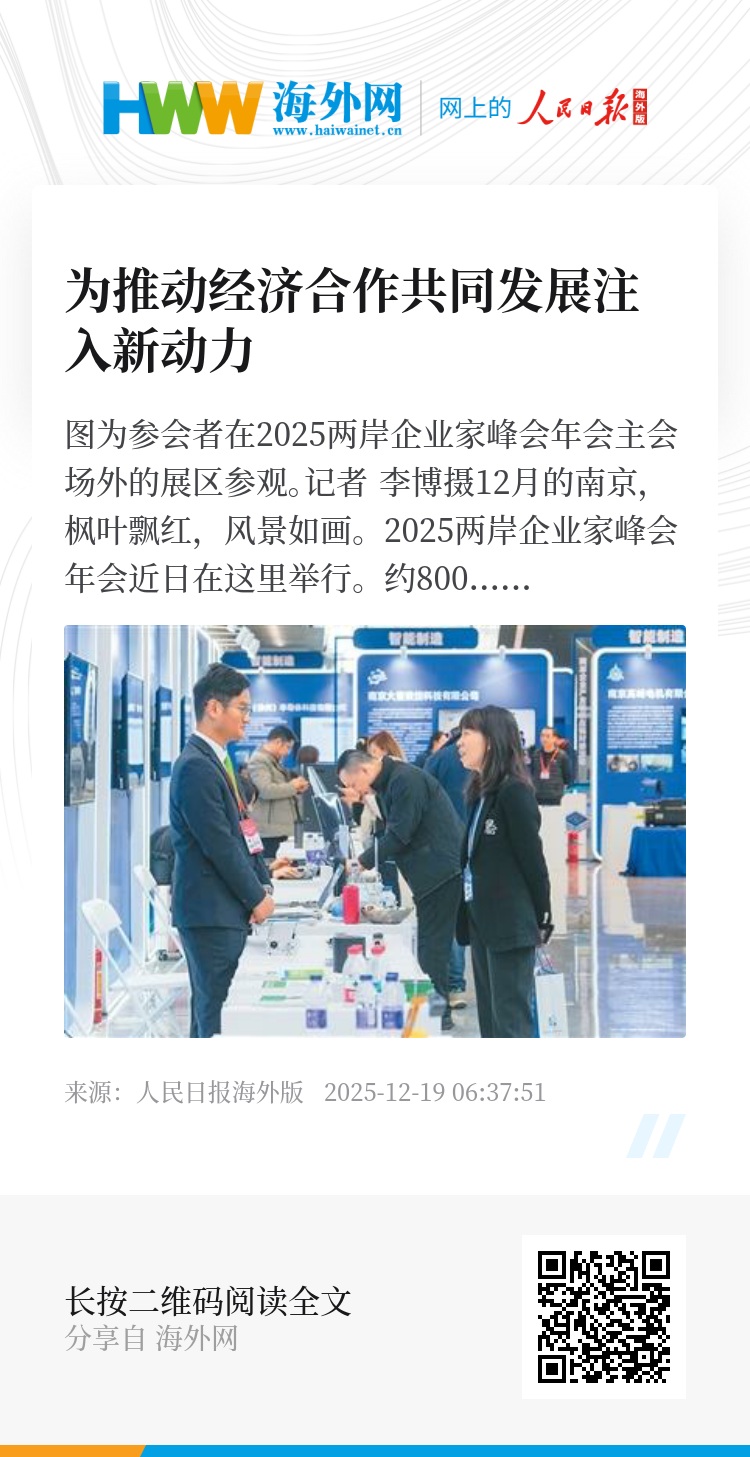12月的南京,枫叶飘红,风景如画。2025两岸企业家峰会年会近日在这里举行。约800名两岸企业家、专家学者与各界代表齐聚扬子江畔,围绕“聚焦转型创新 深化多链合作”主题,共商发展大计。