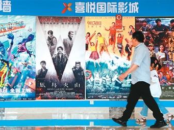 2025年10月4日,云南蒙自喜悦国际影城,观众从国庆档电影海报前经过。