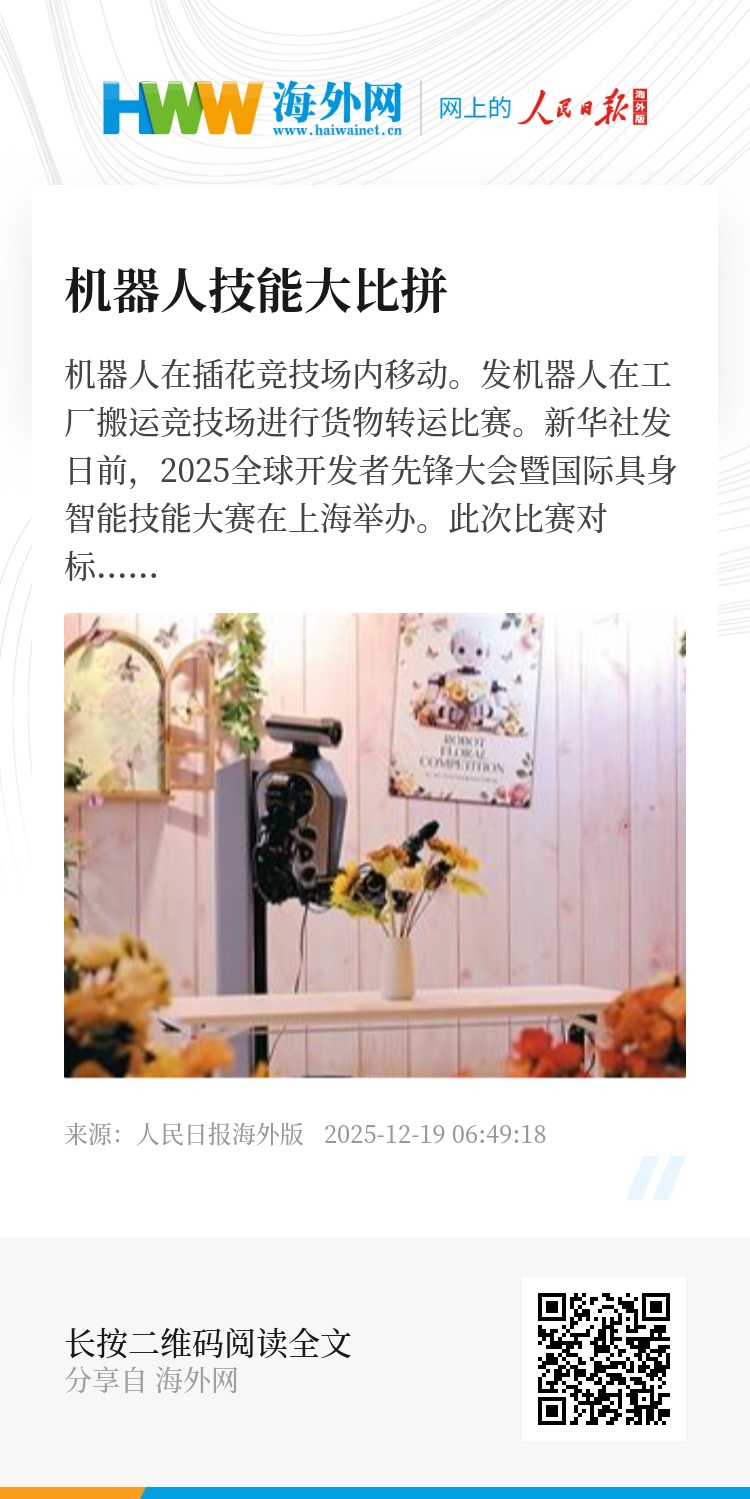 日前,2025全球开发者先锋大会暨国际具身智能技能大赛在上海举办。此次比赛对标世界技能大赛,赛事覆盖工业搬运、餐厅服务、花艺、应急救援等多个领域。来自各地企业、实验室与创新团队的百余支队伍展开角逐,通过评估各类机器人在复杂、动态环境中的实际执行能力、稳定性和适应性,展现具身智能融入人类生活的诸多场景。