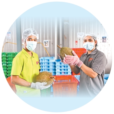 马来西亚的榴莲从果园采摘到送到中国消费者手中,全程最快仅需36小时。图为在马来西亚雪兰莪州的一家榴莲加工厂内,工作人员向记者展示榴莲。