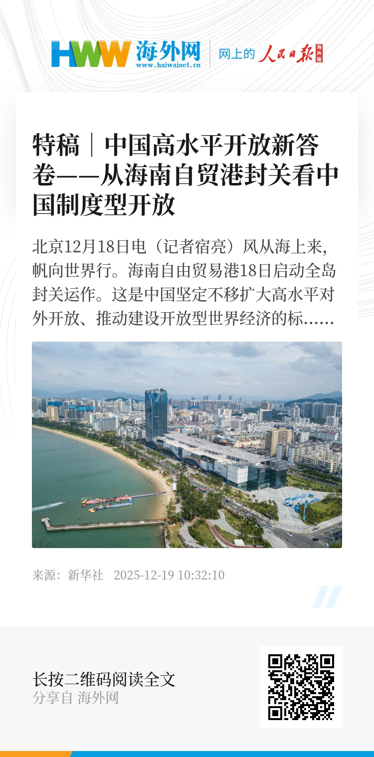 开放是当代中国的鲜明标识。海南自贸港封关运作再次向世界证明,中国持续推动贸易便利化、投资自由化和要素高效流动,坚定不移推进高水平对外开放。