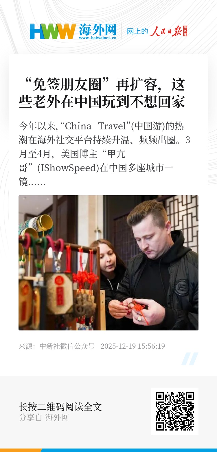 这些海外网红“中国游”的走红,不仅折射出中国作为旅行目的地的吸引力,更与2025年中国持续扩大“免签朋友圈”密切相关。从延长免签期限到扩大免签范围,再到优化入境服务,一系列举措为中外人员往来打开便利之门。