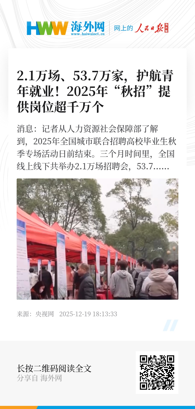 央视网消息:记者从人力资源社会保障部了解到,2025年全国城市联合招聘高校毕业生秋季专场活动日前结束。三个月时间里,全国线上线下共举办2.1万场招聘会,53.7万家用人单位提供岗位信息1099.4万个。