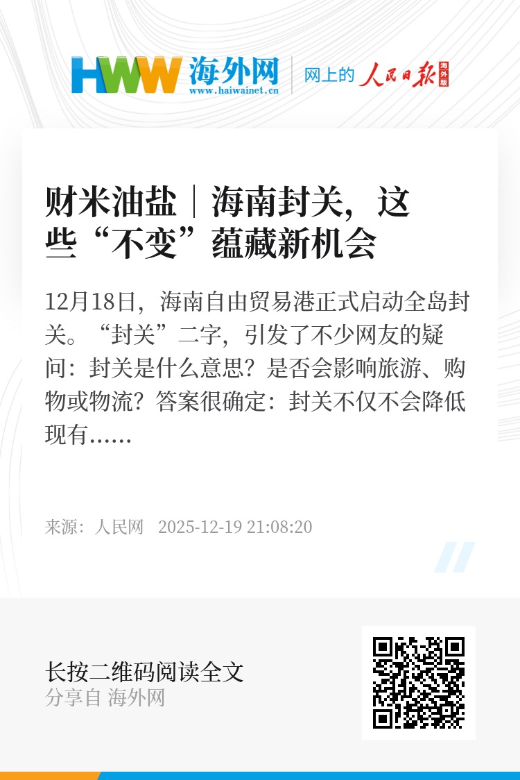 12月18日,海南自由贸易港正式启动全岛封关。“封关”二字,引发了不少网友的疑问:封关是什么意思?是否会影响旅游、购物或物流?