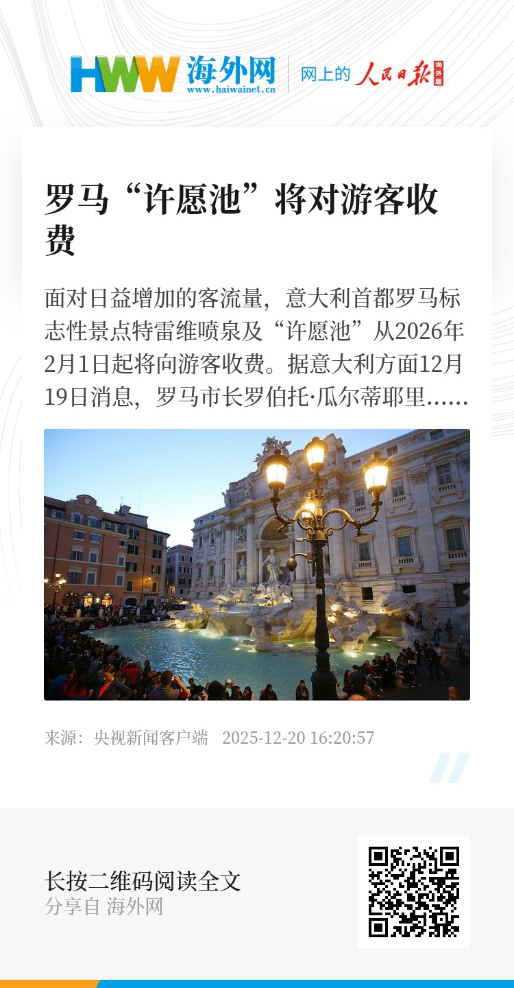面对日益增加的客流量,意大利首都罗马标志性景点特雷维喷泉及“许愿池”从2026年2月1日起将向游客收费。