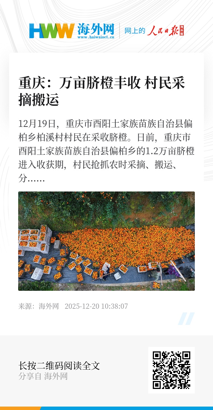 12月19日,重庆市酉阳土家族苗族自治县偏柏乡柏溪村村民在采收脐橙。日前,重庆市酉阳土家族苗族自治县偏柏乡的1.2万亩脐橙进入收获期,村民抢抓农时采摘、搬运、分选脐橙,供应各地市场。图源:视觉中国