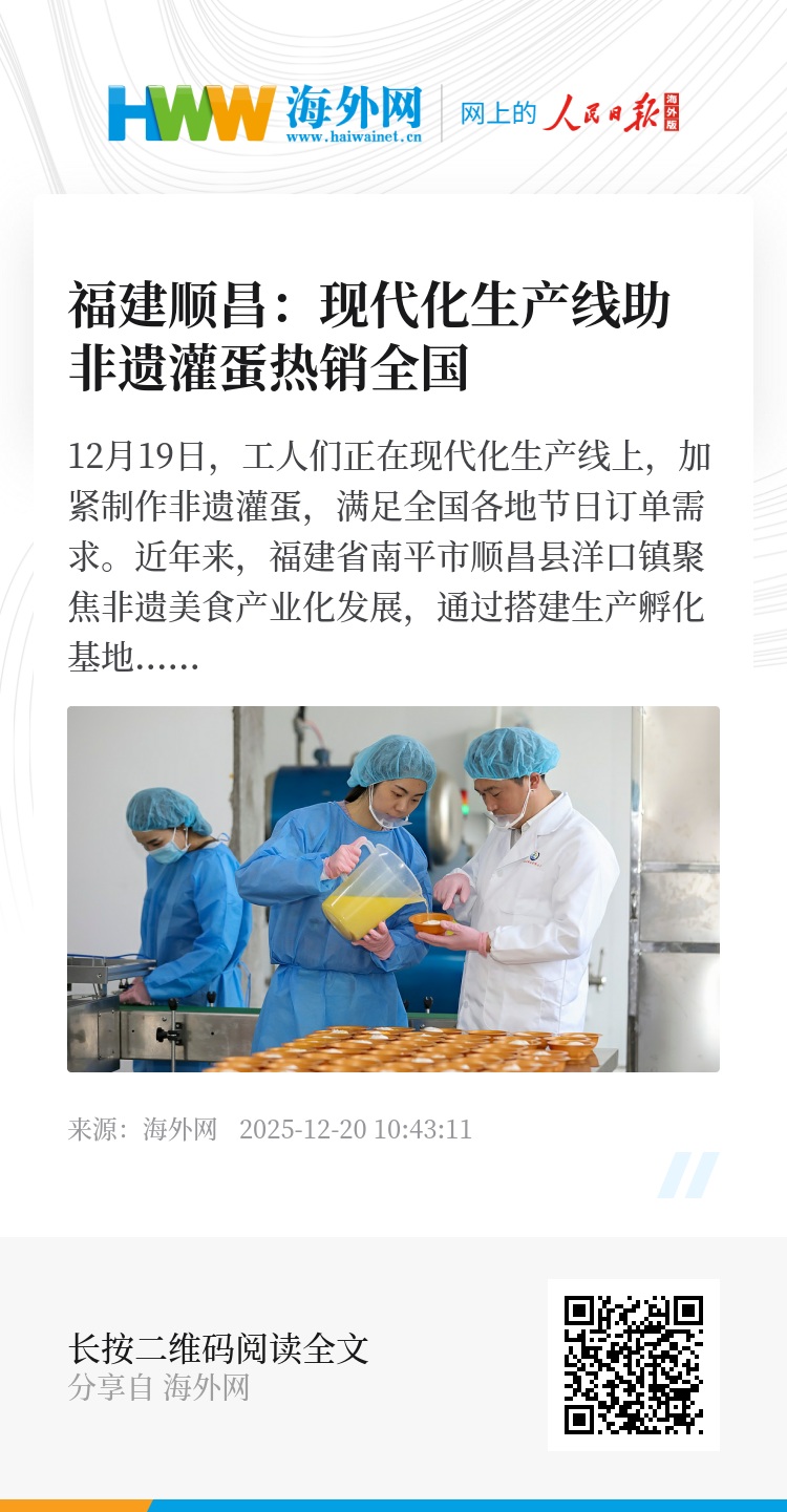 12月19日,工人们正在现代化生产线上,加紧制作非遗灌蛋,满足全国各地节日订单需求。近年来,福建省南平市顺昌县洋口镇聚焦非遗美食产业化发展,通过搭建生产孵化基地、提供非遗技艺培训、开展电商平台直播带货等多元化方式,有效带动农户食材产销、文旅融合和村民就业,让传统非遗美食成为乡村振兴的“金名片”。图源:视觉中国