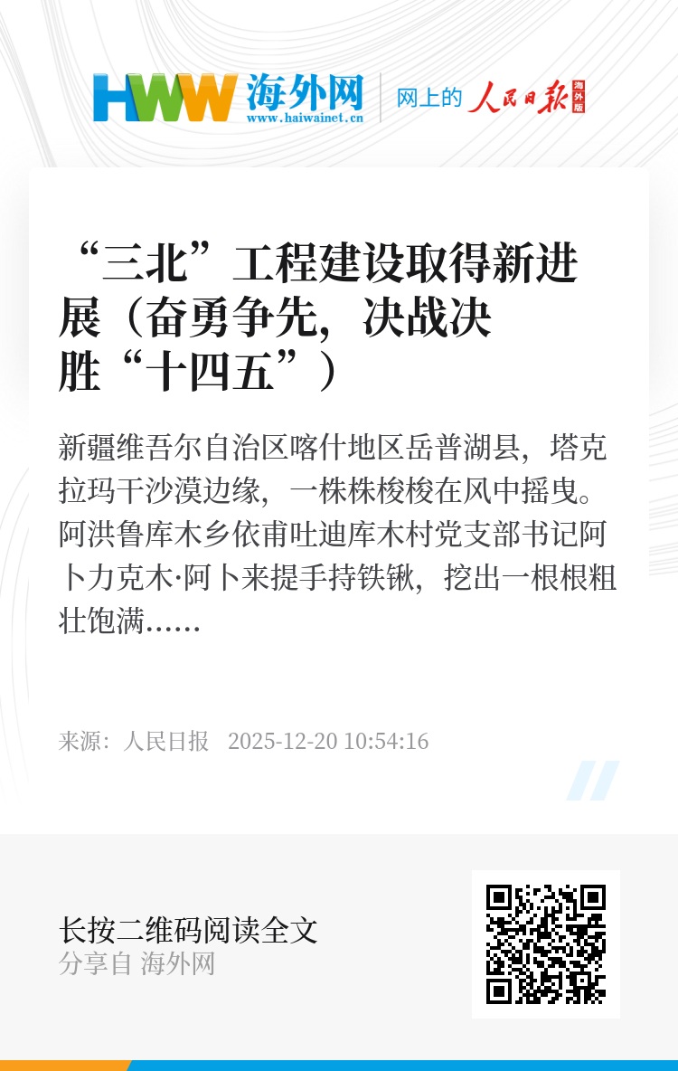 “当前,‘三北’工程正处在全面推进、攻坚克难的关键阶段,我们要牢记习近平总书记殷殷嘱托,在科学保护、系统治理、巩固成果、产业协同等方面持续发力,不断提升‘三北’工程区生态系统的多样性、稳定性和持续性,努力创造新时代中国防沙治沙新奇迹。”国家林草局相关负责人表示。(本报记者 董丝雨)