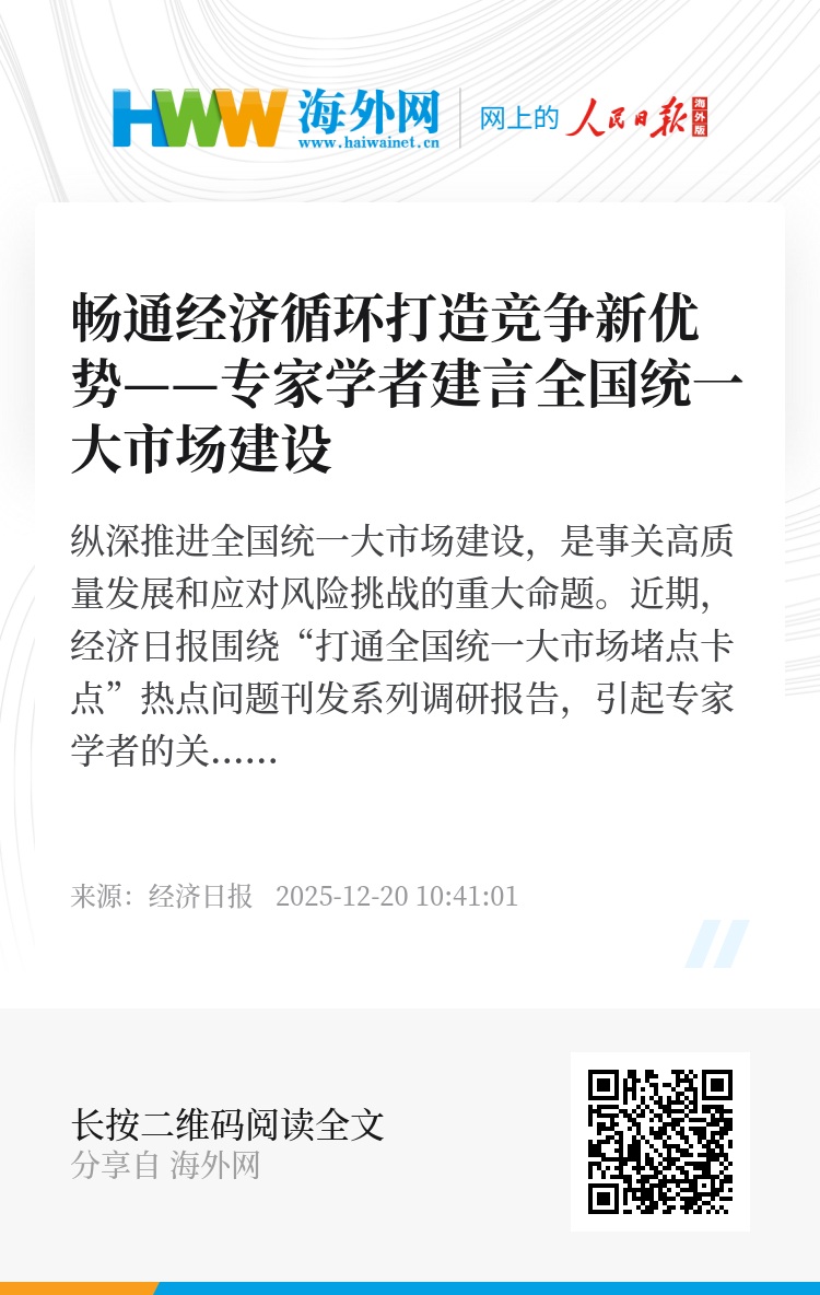 破壁清障方能畅通循环。“破的目的是为了打通堵点。及时破,方能立得稳。”朱克力表示,既要破除妨碍要素自由流动的政策壁垒,探索形成全国统一的要素流通规则,清理地方保护性措施,打通技术、数据等新要素跨区域流动通道;又要消除监管标准、招投标规则的省际差异,建立统一规范的市场基础制度,降低企业跨区域经营的制度性交易成本,实现规则衔接、执法协同;还要破除财税分配、考核评价的路径依赖,确立基于区域发展实际的激励约束机制,引导各地因地制宜培育发展特色优势产业。与此同时,应补齐省际物流衔接、政务数据互认等基础设施短板,以软硬协同的扎实举措,充分激活超大规模市场的澎湃动能。