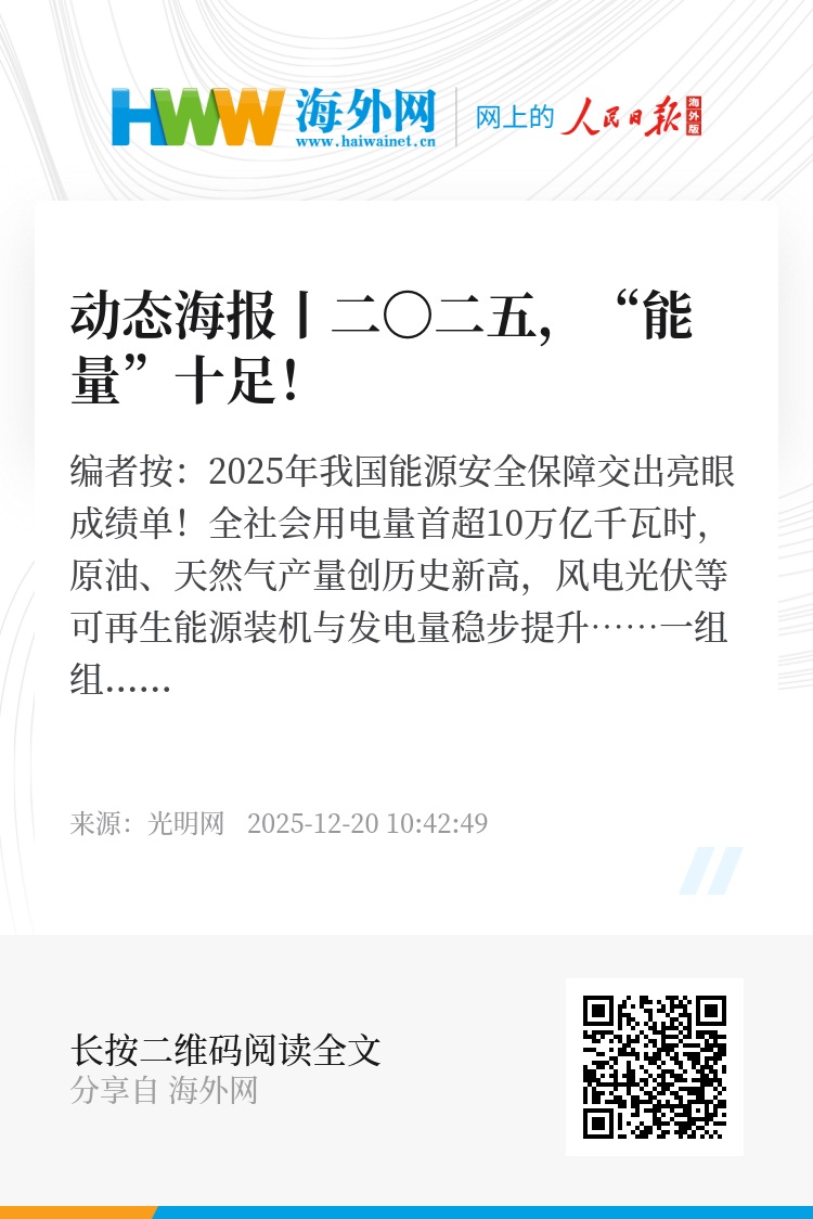 编者按:2025年我国能源安全保障交出亮眼成绩单!全社会用电量首超10万亿千瓦时,原油、天然气产量创历史新高,风电光伏等可再生能源装机与发电量稳步提升……一组组数据彰显了我国能源体系韧性与实力。让我们通过一组动态海报来了解这些亮眼成果。