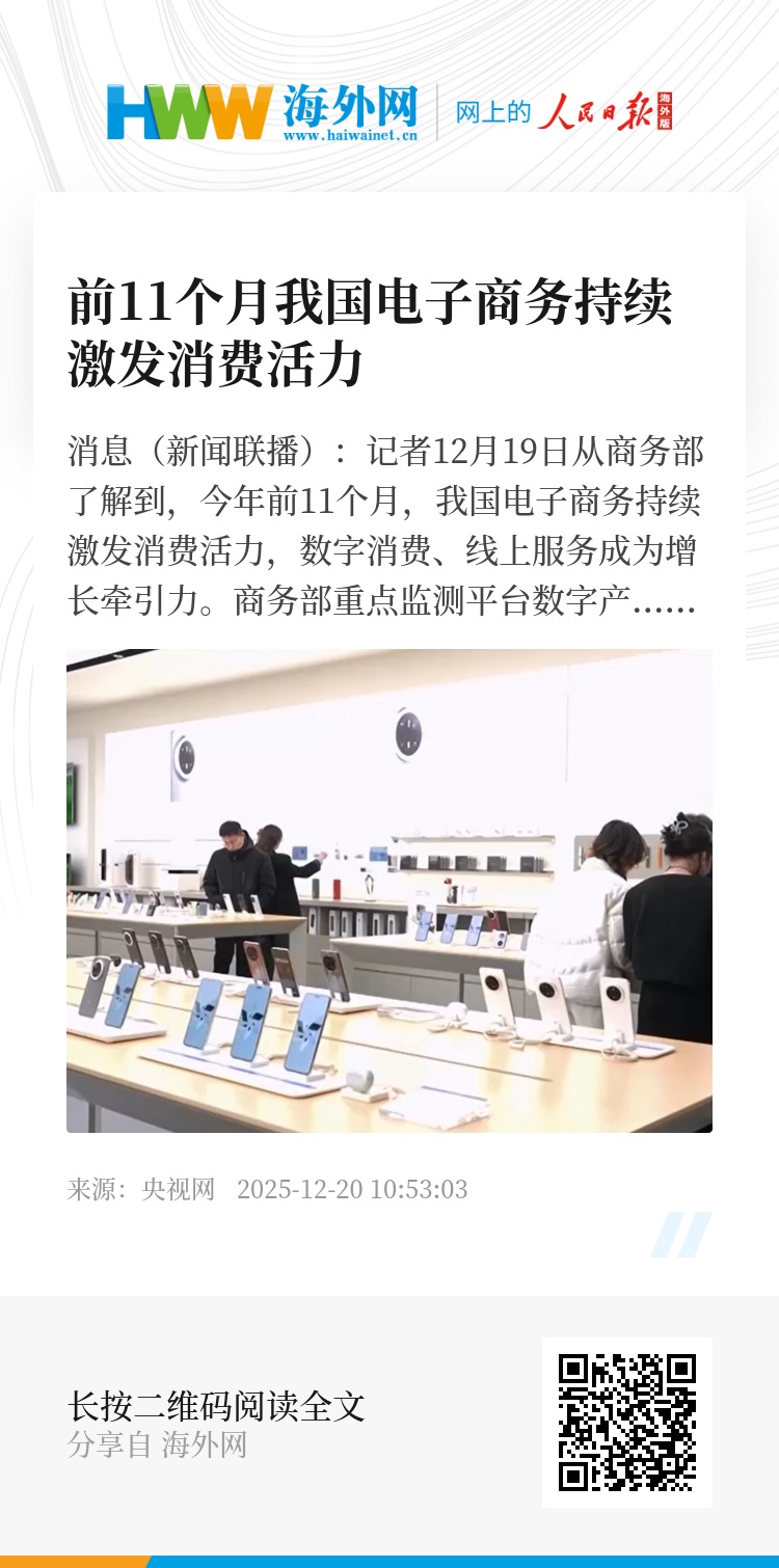 央视网消息(新闻联播):记者12月19日从商务部了解到,今年前11个月,我国电子商务持续激发消费活力,数字消费、线上服务成为增长牵引力。商务部重点监测平台数字产品增长8.2%,其中智能穿戴、智能机器人分别保持两位数增长,线上服务消费增长21.7%。