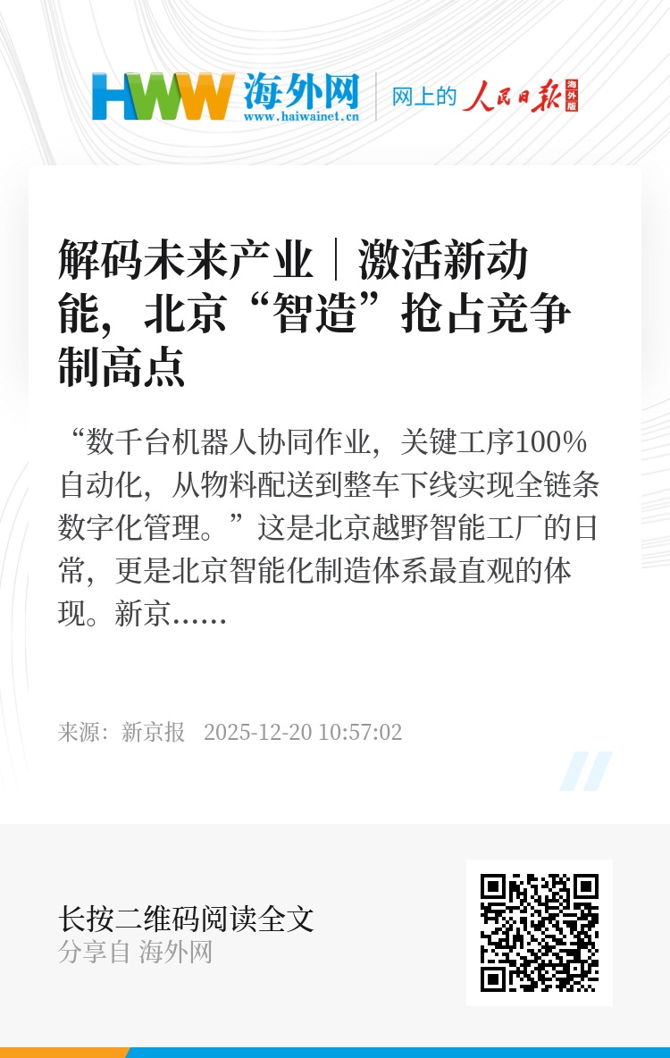 “数千台机器人协同作业,关键工序100%自动化,从物料配送到整车下线实现全链条数字化管理。”这是北京越野智能工厂的日常,更是北京智能化制造体系最直观的体现。