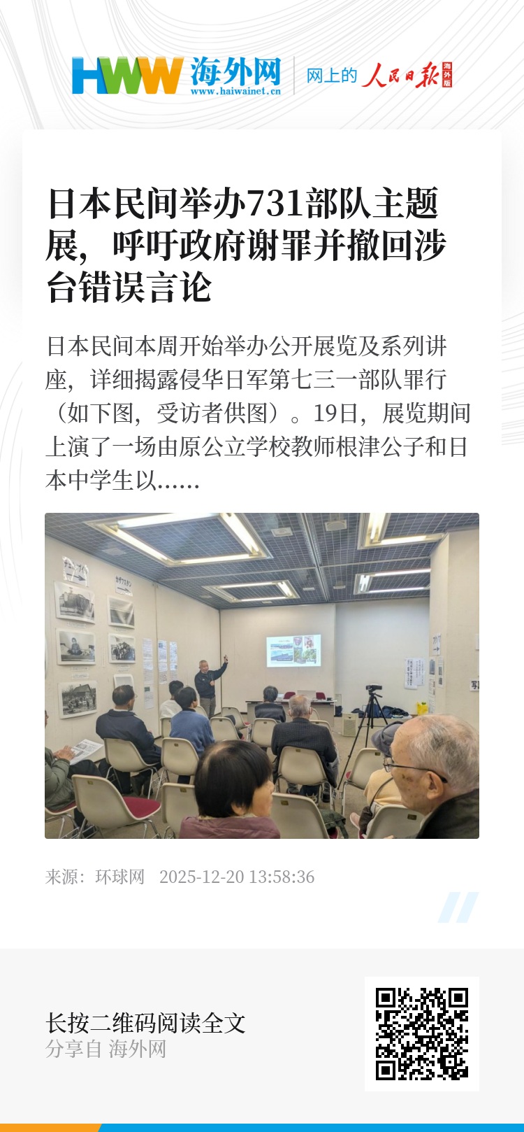 据介绍,本次展览聚焦731部队(即关东军防疫给水部)、原子弹爆炸事件及冷战时期核试验等历史,于12月17日至22日在东京举办。展览由“731部队展执行委员会”等民间团体主办,通过展板展示与主题讲座相结合的方式,向公众揭露日本侵华战争的真相。