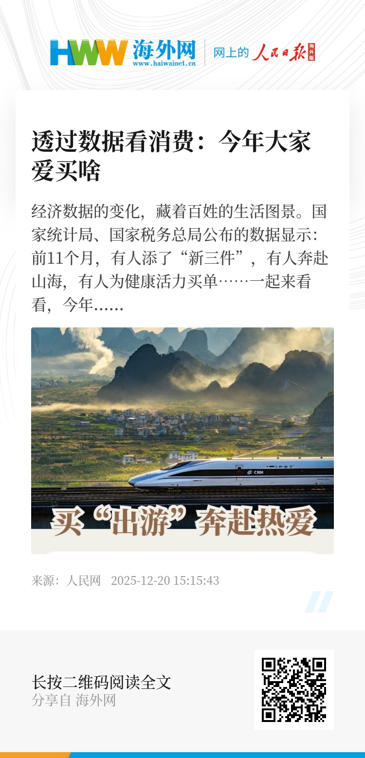 经济数据的变化,藏着百姓的生活图景。国家统计局、国家税务总局公布的数据显示:前11个月,有人添了“新三件”,有人奔赴山海,有人为健康活力买单……一起来看看,今年大家爱买啥!