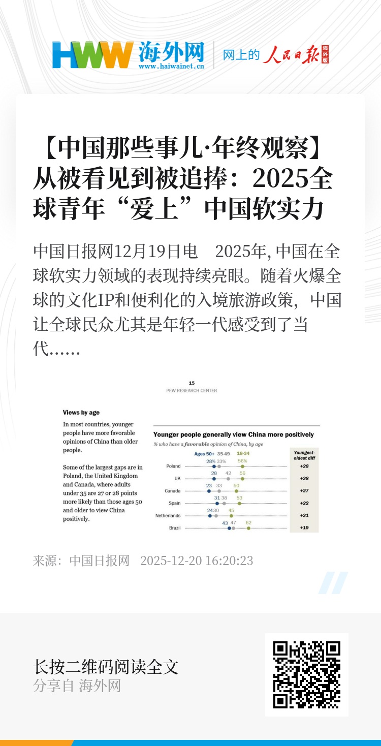 2025年7月,美国皮尤研究中心(Pew)发布的最近一期全球调查报告显示,基于25个国家逾3万名受访者数据,多数国家的年轻人(通常指35岁以下)对中国持更为正面的看法。特别是在波兰、英国和加拿大,35岁以下年轻人比50岁以上年长者对华态度更为正面。这一趋势覆盖高收入和中低收入国家,反映年轻一代对中国的认知正发生积极转变。