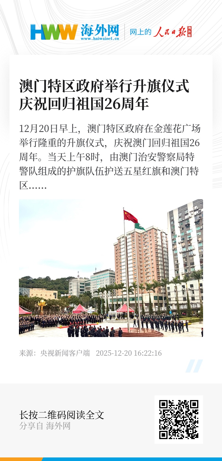 12月20日早上,澳门特区政府在金莲花广场举行隆重的升旗仪式,庆祝澳门回归祖国26周年。