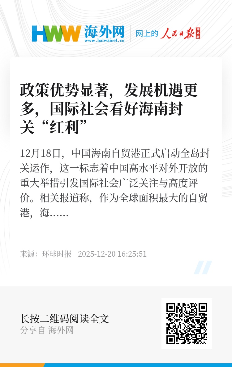 从战略意义来看,海南自贸港封关的价值远超关税优惠本身。亚洲新闻台援引观察人士的观点称,海南正成为中国制度开放的试验场,在人员、货物、资本、数据自由流动及简化贸易程序等方面探索的经验,未来有望推广至全国。对此,梁海明强调称,海南自贸港以高水平开放促进国内国际双循环,是中国对外开放的标志性举措与高水平自贸港制度的重要实践。【环球时报记者 郭媛丹 环球时报驻俄罗斯特派记者 肖新新 环球时报驻法国特约记者 董铭】