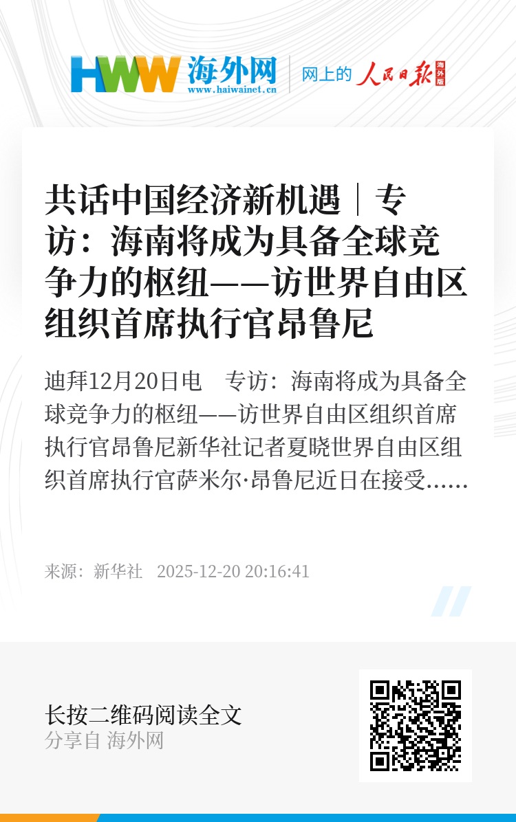 新华社迪拜12月20日电 专访:海南将成为具备全球竞争力的枢纽——访世界自由区组织首席执行官昂鲁尼