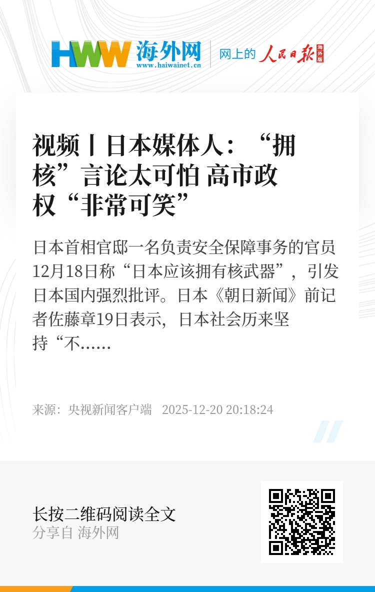 日本《朝日新闻》前记者佐藤章19日表示,日本社会历来坚持“不拥有核武器、以无核追求和平”的坚定立场,此类言论在过去绝对不可能出现。而高市早苗担任首相以来,不仅从官邸传出拥核言论,还企图修改“无核三原则”,特别是“不运进核武器”这一条款,事态已经发展至“可怕”的程度。佐藤章还说,高市政权持续到现在“非常可笑”,像是丧失了正常的判断能力。