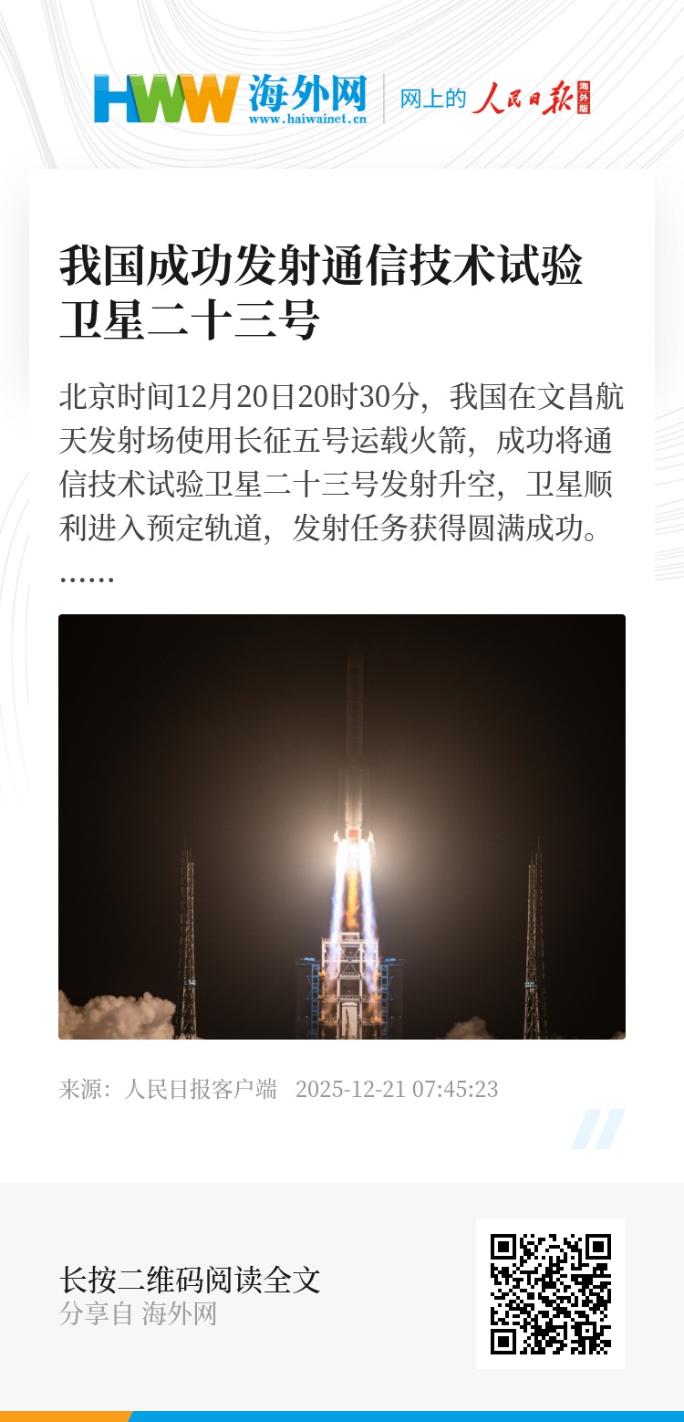 北京时间12月20日20时30分,我国在文昌航天发射场使用长征五号运载火箭,成功将通信技术试验卫星二十三号发射升空,卫星顺利进入预定轨道,发射任务获得圆满成功。