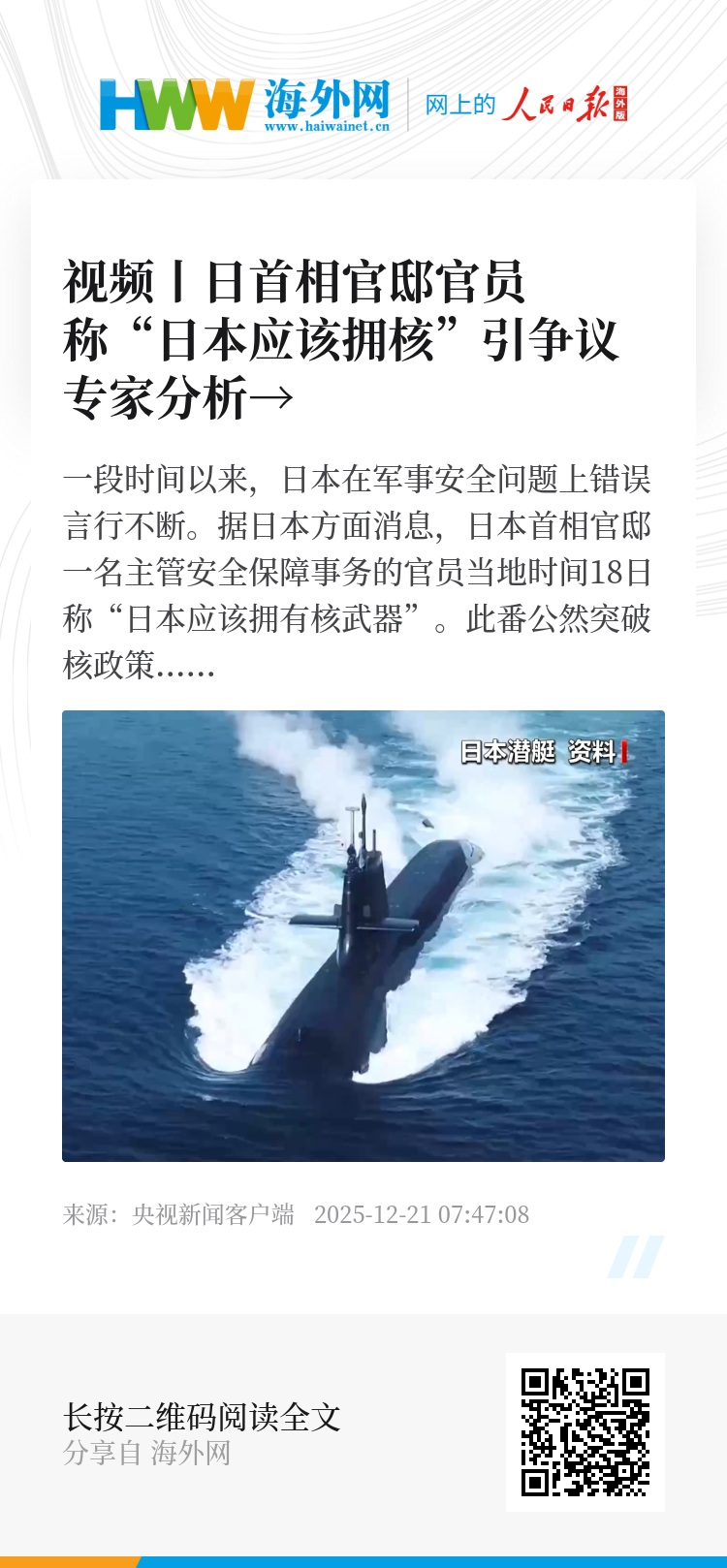 一段时间以来,日本在军事安全问题上错误言行不断。据日本方面消息,日本首相官邸一名主管安全保障事务的官员当地时间18日称“日本应该拥有核武器”。此番公然突破核政策底线的言论一经曝出,立即在日本国内引发巨大争议。