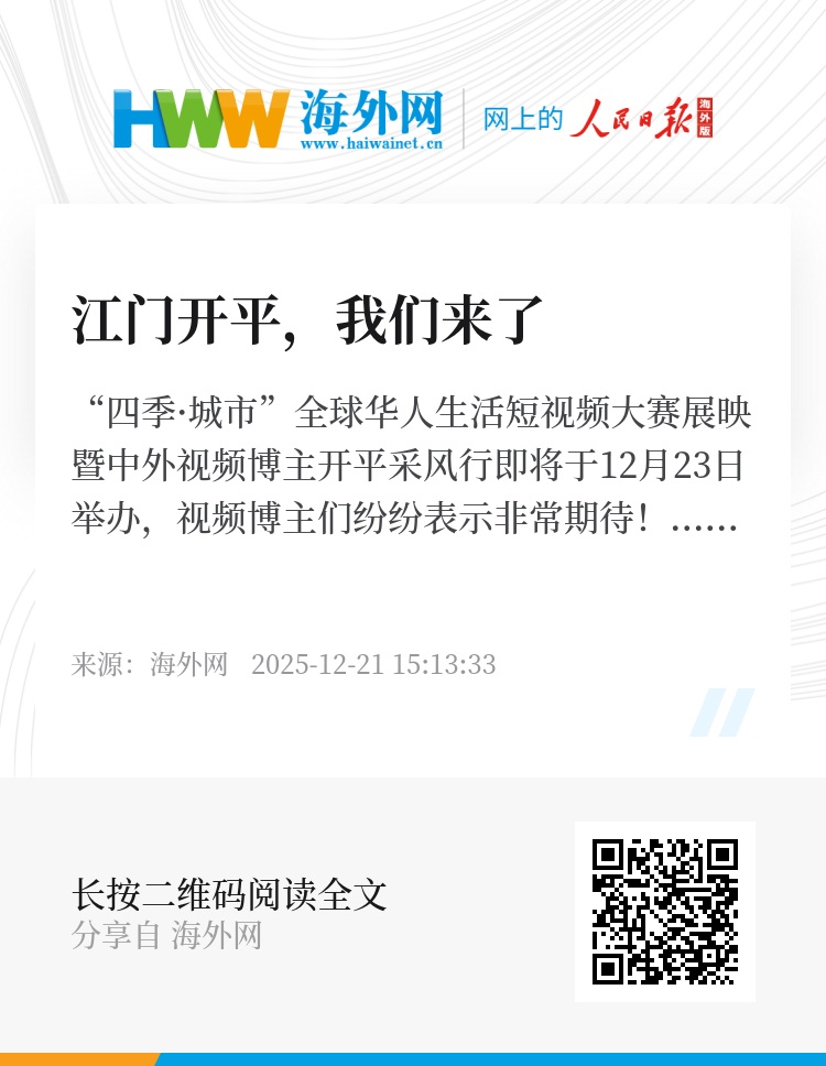 “四季·城市”全球华人生活短视频大赛展映暨中外视频博主开平采风行即将于12月23日举办,视频博主们纷纷表示非常期待!