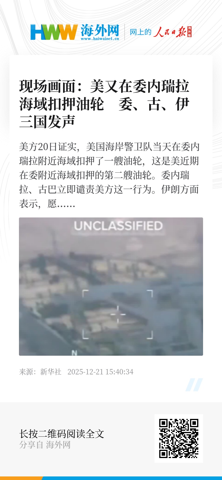 美国国土安全部长诺姆在社交媒体上发文称,美国海岸警卫队20日凌晨在国防部支持下,扣押了一艘“此前停靠在委内瑞拉的油轮”。