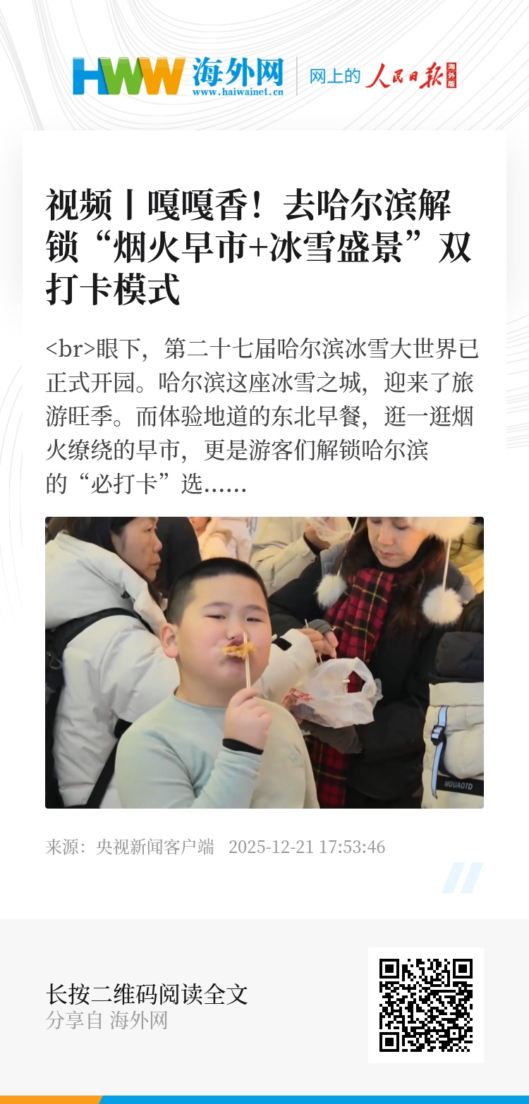 从街头逛到街尾,走一路、看一路、吃一路。天色渐渐由暗转亮,游客们手里的袋子也越来越鼓。一顿看似寻常的早餐,却成了连接五湖四海游客与这座城市的温暖纽带。它让冒着严寒赶早的人们暖了胃,更让远道而来的朋友,瞬间触摸到了哈尔滨的鲜活脉搏。