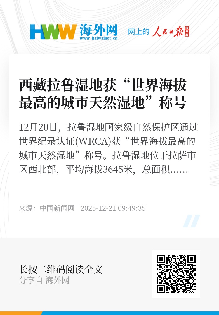 12月20日,拉鲁湿地国家级自然保护区通过世界纪录认证(WRCA)获“世界海拔最高的城市天然湿地”称号。拉鲁湿地位于拉萨市区西北部,平均海拔3645米,总面积约12.2平方公里,是典型的青藏高原湿地,被誉为“拉萨之肺”。这里水草丰茂、鸟类栖息丰富,是城市中难得的天然生态宝地。多年来,西藏持续推进湿地保护与生态修复工程,使湿地生态功能不断提升,在涵养水源、调节气候、维护生物多样性等方面发挥着重要作用。(谢牧 徐国强)