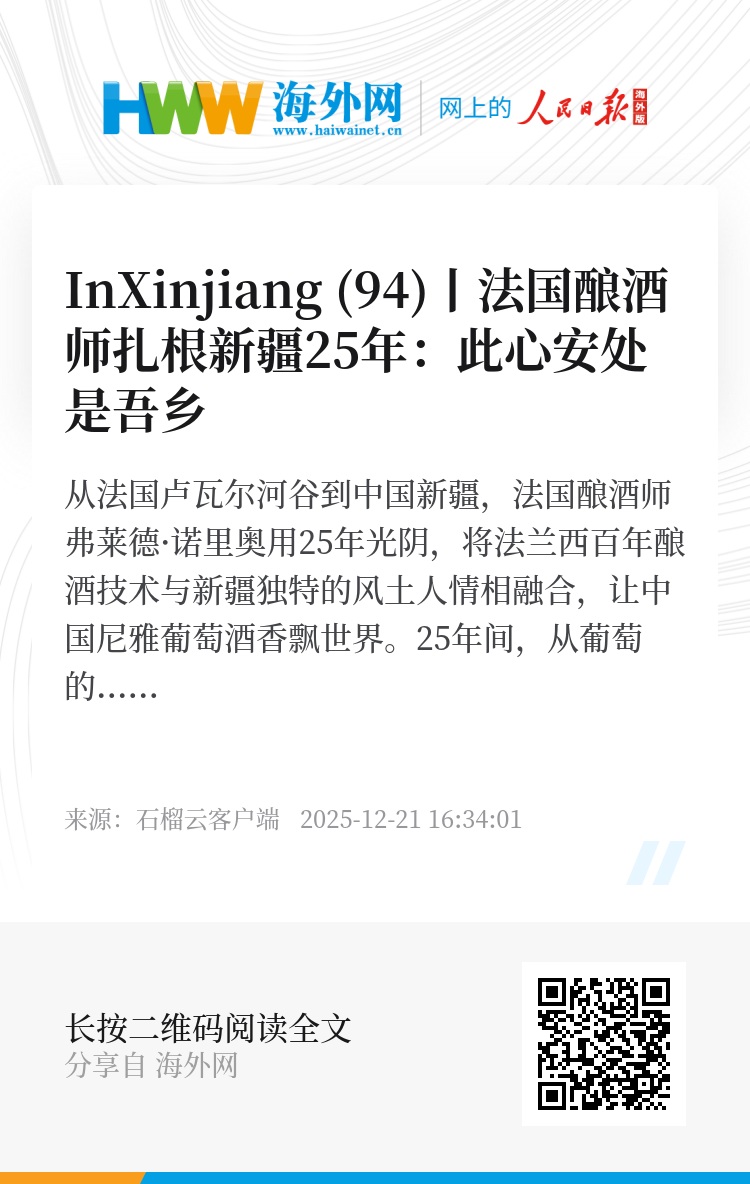 从法国卢瓦尔河谷到中国新疆,法国酿酒师弗莱德·诺里奥用25年光阴,将法兰西百年酿酒技术与新疆独特的风土人情相融合,让中国尼雅葡萄酒香飘世界。