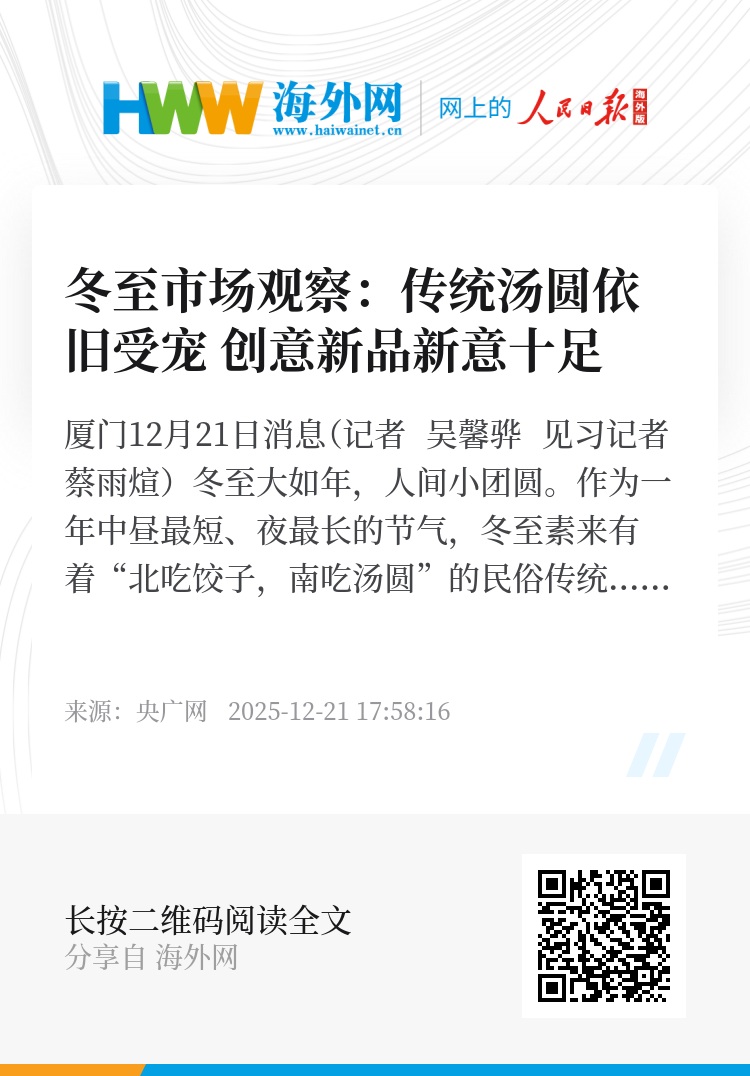 “冬至吃汤圆,在闽南不只是一种食物,更是一种文化符号,承载着对团圆、圆满、添岁的殷切期盼。”厦门大学传播学副教授表示,“如今市场的创新,可以看作是传统文化与当代生活的一次深度对话。商家通过对配方、形态、乃至食用场景的创新,让古老的习俗以更轻盈、更个性化、更健康的方式融入现代人的日常,这实际上是对传统文化生命力的一种延续和增强。”