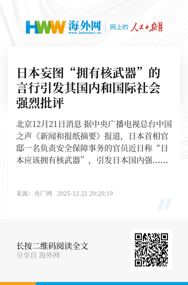 央广网北京12月21日消息 据中央广播电视总台中国之声《新闻和报纸摘要》报道,日本首相官邸一名负责安全保障事务的官员近日称“日本应该拥有核武器”,引发日本国内强烈批评。
