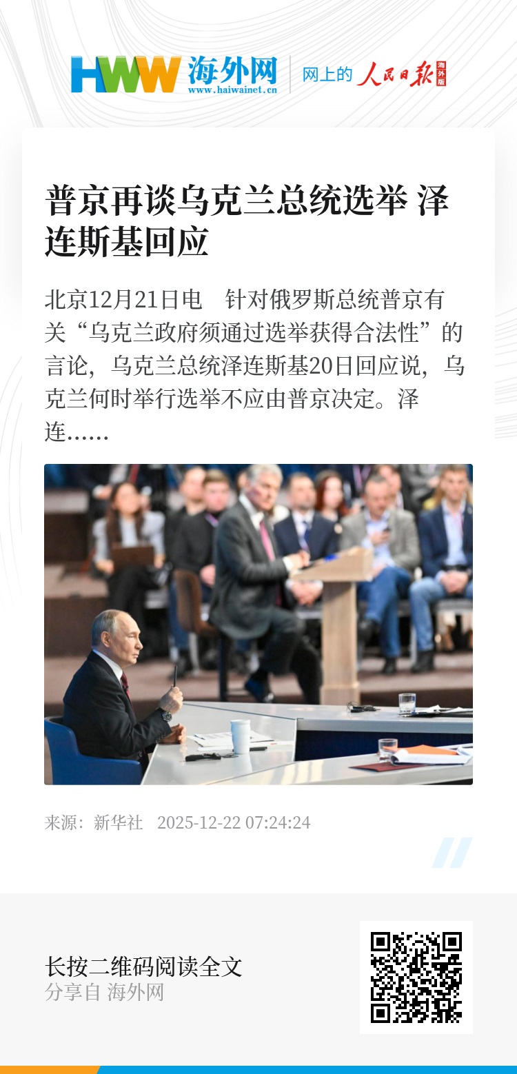 新华社北京12月21日电 针对俄罗斯总统普京有关“乌克兰政府须通过选举获得合法性”的言论,乌克兰总统泽连斯基20日回应说,乌克兰何时举行选举不应由普京决定。