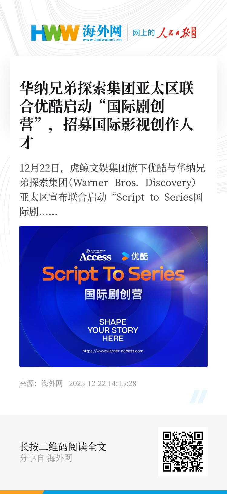 12月22日,虎鲸文娱集团旗下优酷与华纳兄弟探索集团(Warner Bros. Discovery)亚太区宣布联合启动 “Script to Series国际剧创营”,面向全球招募新锐影视创作者,打造更多具有国际视野的中文原创剧本内容。