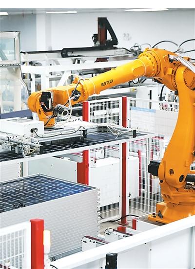 12月15日,位于江苏省淮安市的一家新能源企业生产车间内,机械臂加工光伏组件。殷潮摄(人民视觉)