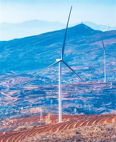 12月15日,河南省洛阳市嵩县九皋镇风电场,一排排风力发电机组迎风转动。张怡熙摄(人民视觉)