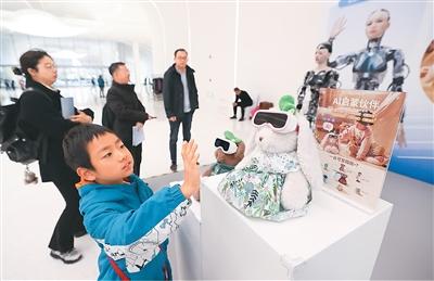 北京中关村国际创新中心内,一名小朋友在“2025人工智能+”大会展区上与AI陪伴玩具互动。陈晓根摄(人民视觉)