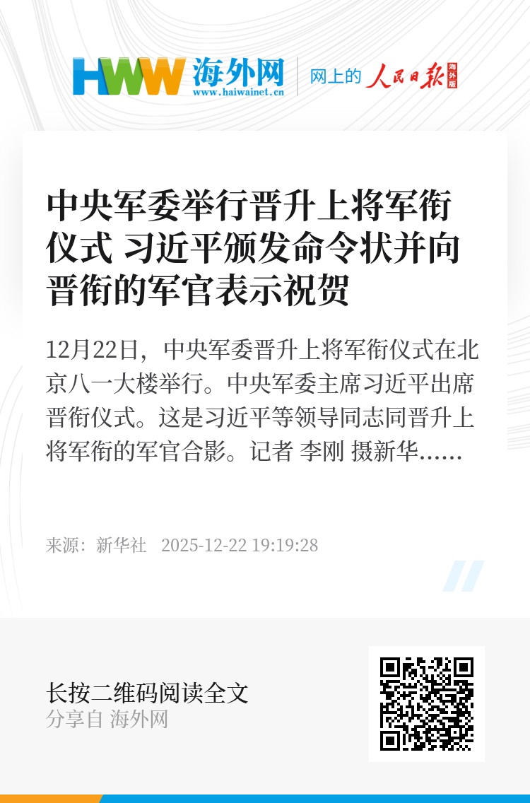 新华社北京12月22日电(记者梅常伟)中央军委晋升上将军衔仪式22日在北京八一大楼举行。中央军委主席习近平出席晋衔仪式。