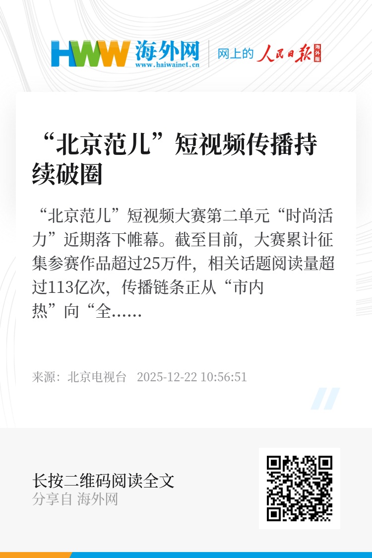 “北京范儿”短视频大赛第二单元“时尚活力”近期落下帷幕。截至目前,大赛累计征集参赛作品超过25万件,相关话题阅读量超过113亿次,传播链条正从“市内热”向“全国热”“全球热”加速延展。