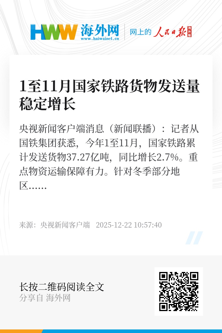 央视新闻客户端消息(新闻联播):记者从国铁集团获悉,今年1至11月,国家铁路累计发送货物37.27亿吨,同比增长2.7%。