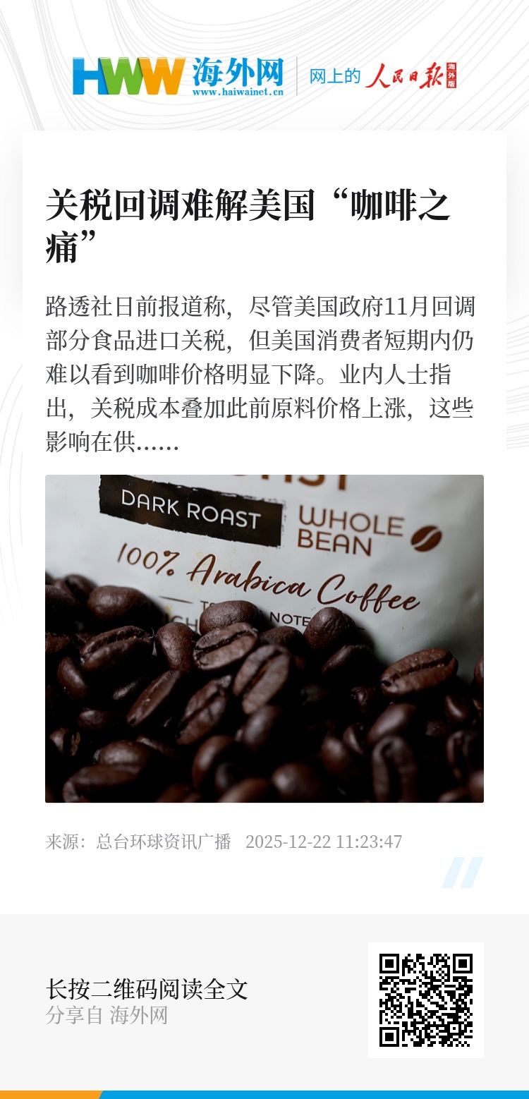 报道提到,今年11月,在民主党赢得新泽西、纽约和弗吉尼亚等州的选举胜利、选民对食品价格不满情绪上升的背景下,本届美国政府撤销了对咖啡等200多种“难以在美国本土生产”的食品征收10%至41%所谓“对等关税”。
