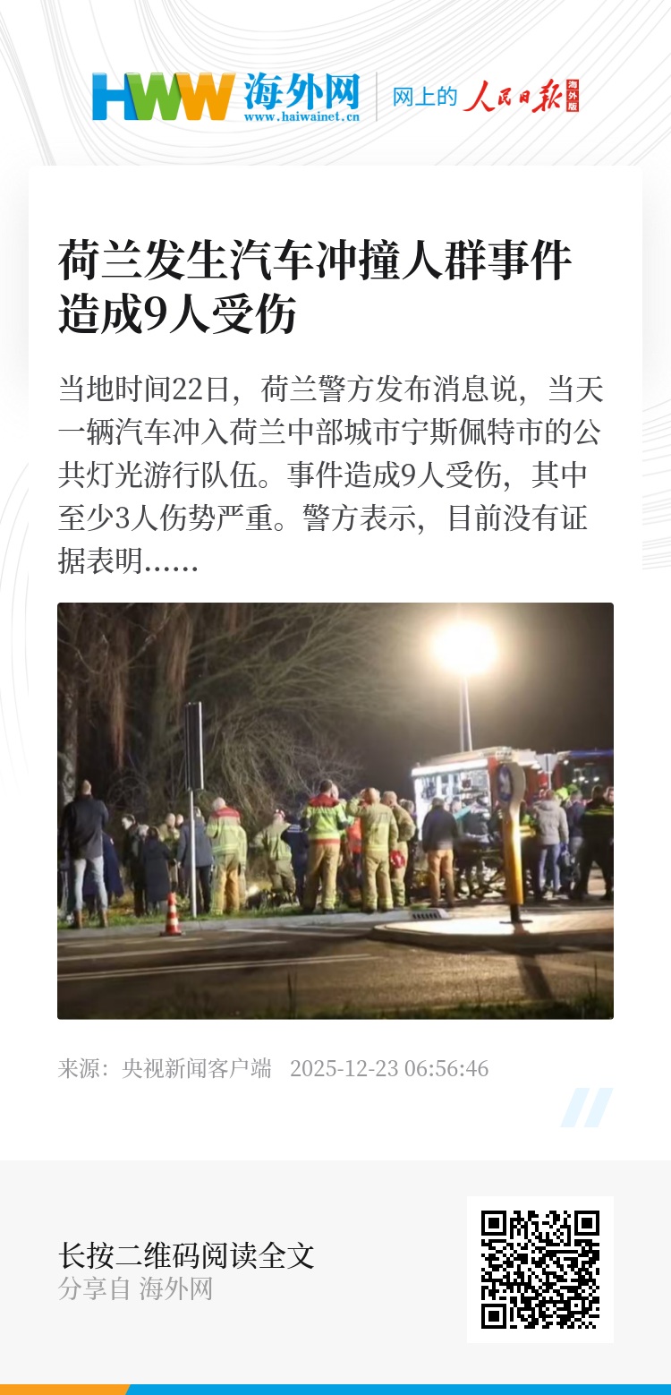 当地时间22日,荷兰警方发布消息说,当天一辆汽车冲入荷兰中部城市宁斯佩特市的公共灯光游行队伍。事件造成9人受伤,其中至少3人伤势严重。