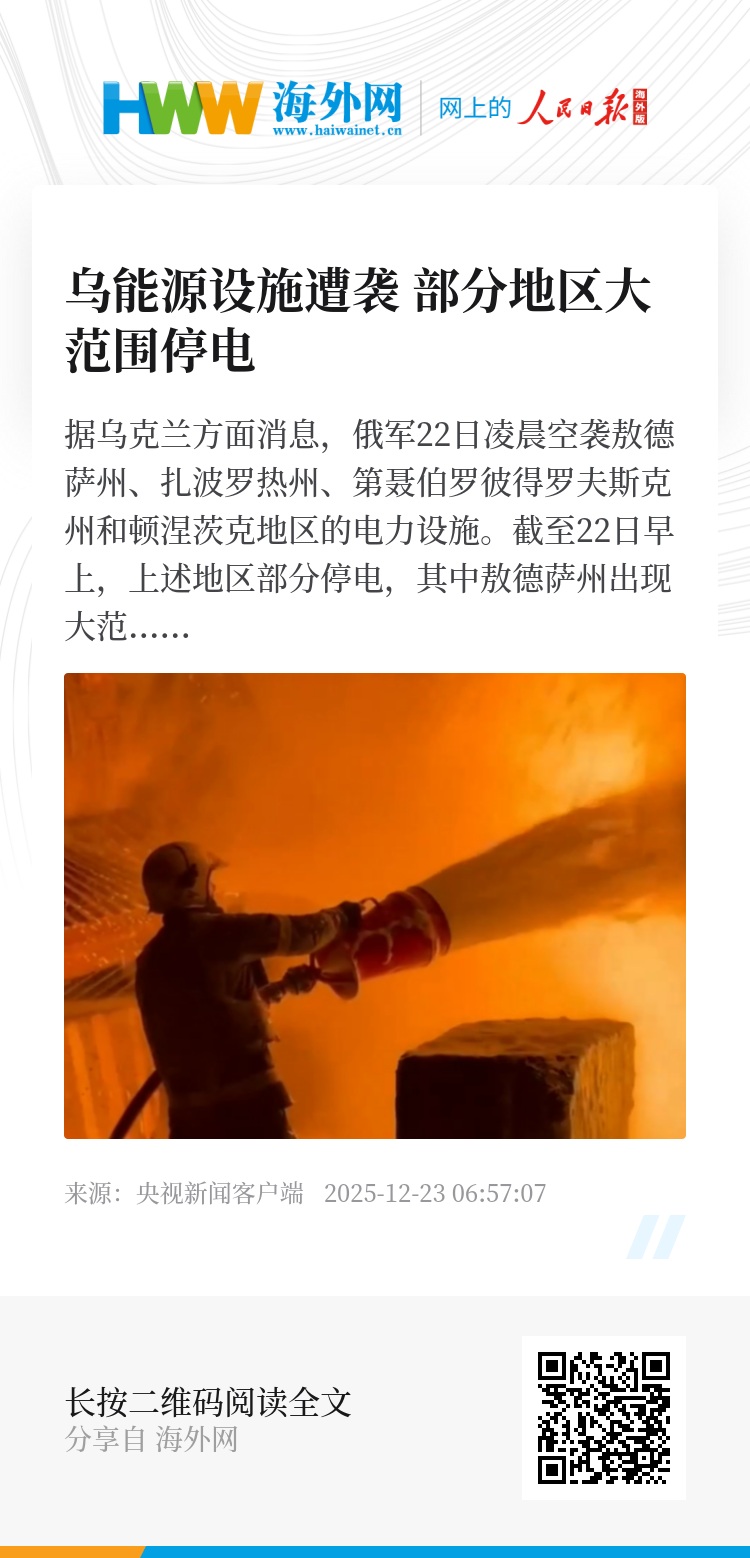 乌克兰DTEK能源公司发文称,俄军22日凌晨袭击该企业位于敖德萨州的两处电力设施,电力设施严重受损。该能源公司称,修复受损设备需要耗费时间,持续不断的空袭警报增加修复难度,技术人员正在加紧工作以尽快修复关键设施并恢复供电。
