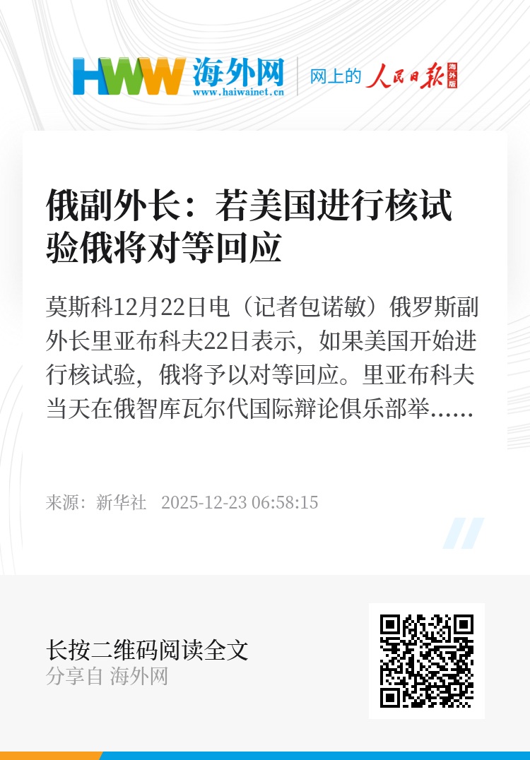 新华社莫斯科12月22日电(记者包诺敏)俄罗斯副外长里亚布科夫22日表示,如果美国开始进行核试验,俄将予以对等回应。