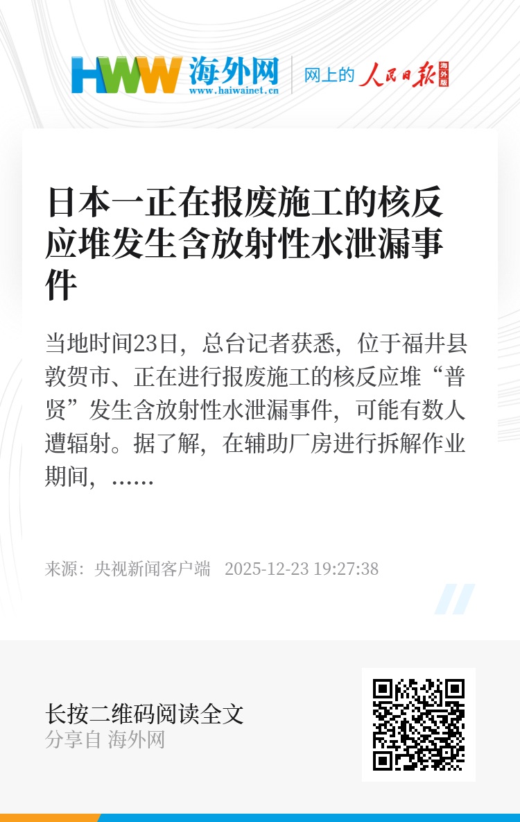 当地时间23日,总台记者获悉,位于福井县敦贺市、正在进行报废施工的核反应堆“普贤”发生含放射性水泄漏事件,可能有数人遭辐射。