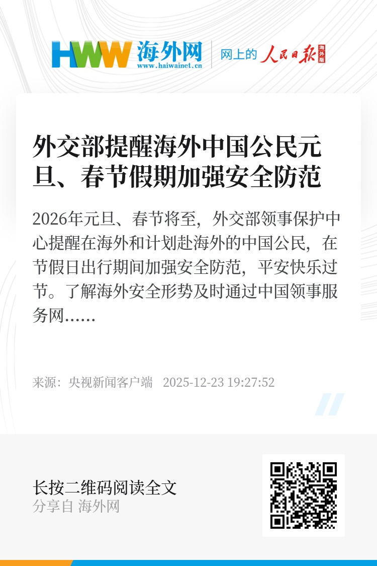 2026年元旦、春节将至,外交部领事保护中心提醒在海外和计划赴海外的中国公民,在节假日出行期间加强安全防范,平安快乐过节。