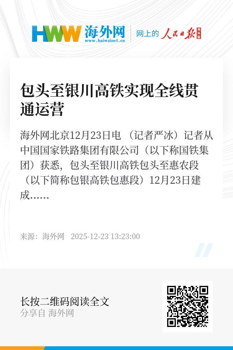 海外网北京12月23日电 (记者严冰)记者从中国国家铁路集团有限公司(以下称国铁集团)获悉,包头至银川高铁包头至惠农段(以下简称包银高铁包惠段)12月23日建成通车,包头至银川高铁实现全线贯通运营,新时代西部大开发注入新动能。