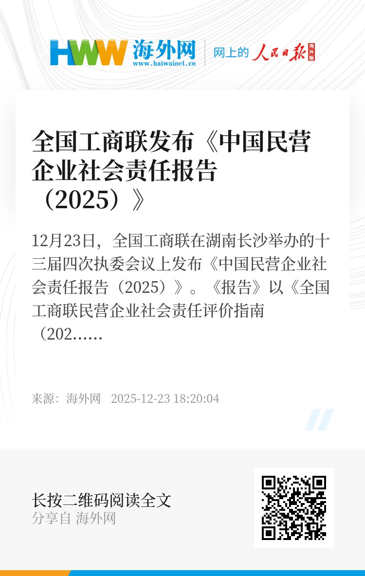 12月23日,全国工商联在湖南长沙举办的十三届四次执委会议上发布《中国民营企业社会责任报告(2025)》。
