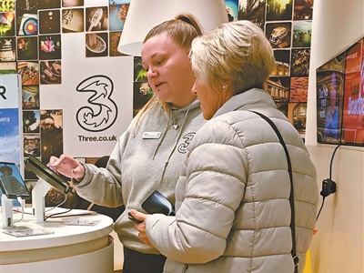 在一家英国通信运营商零售店内,几名消费者正在荣耀手机专柜前挑选产品。“这款手机是今年5月上市的产品,配备较好的AI功能,摄影摄像效果不错,很受消费者喜爱。”门店助理销售经理凯文介绍。